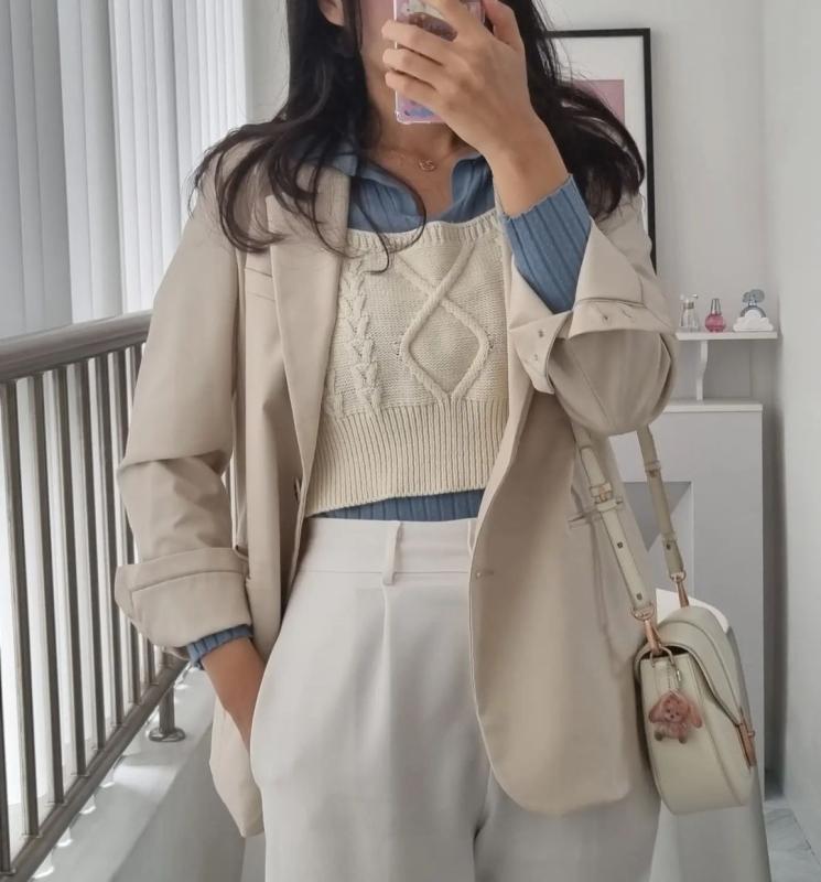 셀피 거울샷 오피스룩 화이트룩코디 니트조끼 니트스커트 ootd 직장인룩 출근룩 데일리룩 블라우스 하객룩 스커트 여름뮤트 여름소프트 스커트코디 블레이저코디