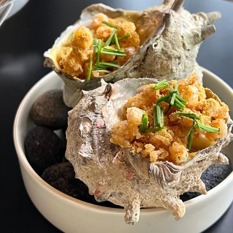 뿔소라 디시를 소개합니다. 부드럽게 저온 조리한 뿔 소라 살을 폴렌타 소스와 마늘 소스, 그리고 달래 향을 듬뿍 담아 준비했습니다.