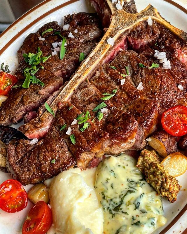 - 티본 스테이크는 미디움으로 티자형 뼈대를 사이에 두고 안심과 등심이 나뉘어요❤️ 식감이 부드럽고 맛있었어요 스테이크 뭐 말해뭐해!