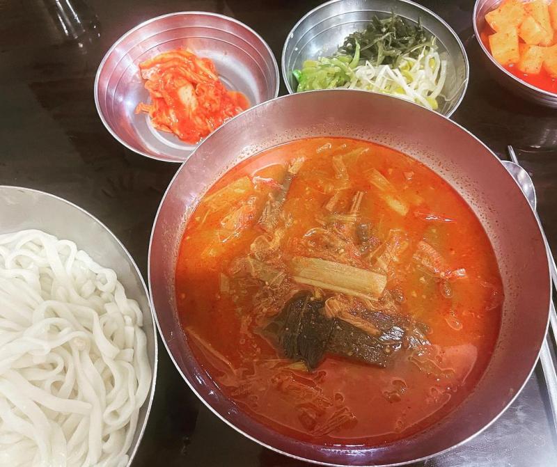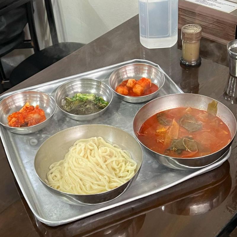 칼국수면이 따로 제공되는데 직접 덜어 국물에 적셔먹으면 됩니다. 꼬들함이 유지되는 탱탱한 칼국수 면과 칼칼한 국물로 해장하기도 좋고 매장에서 직접 담근 김치와 깍두기도 맛있어요.