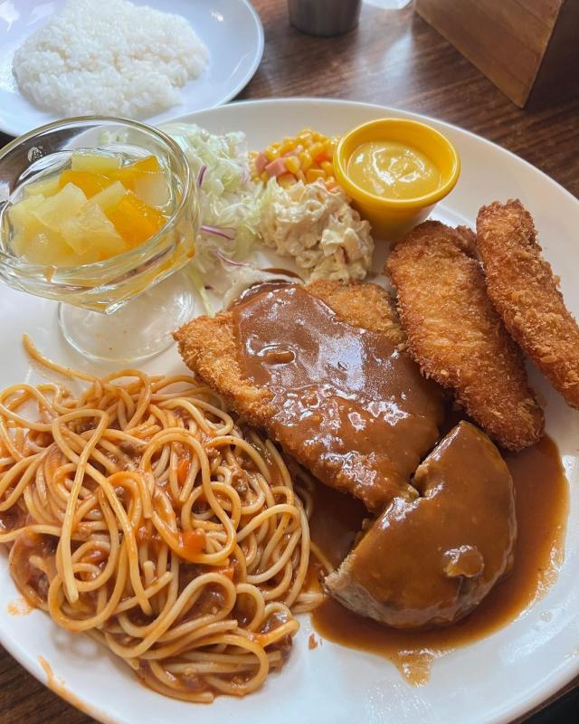 스프를 거의다 먹자마자 바로 메뉴들이 나왔는데 우선 아저씨스페셜 정식은 돈까스, 치킨까스 함박스테이크 반쪽 그리고 스파게티 이렇게 구성되어 있습니다😋